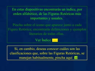 El documento presenta un índice alfabético de figuras retóricas comunes con definiciones y ejemplos. Explica que al hacer clic en cada figura se obtendrá más información y que al hacer clic en otro enlace se podrán ver las clasificaciones de las figuras retóricas según diferentes niveles del lenguaje.