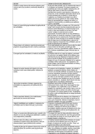 El documento presenta varios retos y aportaciones para mejorar las sesiones de educación física en preescolar, primaria y secundaria. Entre los retos se encuentran establecer mejor interacción maestro-alumno, lograr el control del grupo mediante actividades, y aprovechar al máximo el tiempo. Algunas aportaciones son permitir la comunicación entre maestro y alumnos, considerar las opiniones de los estudiantes, y planificar actividades con una duración específica. El objetivo general es hacer que las sesiones sean más cre