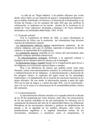 El documento resume las tres dimensiones de la historia de África: un pasado de antiguas civilizaciones que fueron agredidas por la colonización, un presente de incertidumbre e inclusión marginal en el mundo, y un futuro incierto entre la mundialización o el afrocentrismo. El pasado colonial tuvo un gran impacto negativo en África a través de la explotación, genocidio cultural y dominación política. En la actualidad, África sufre crisis del estado, del desarrollo y de la democratización, así como una marginalización