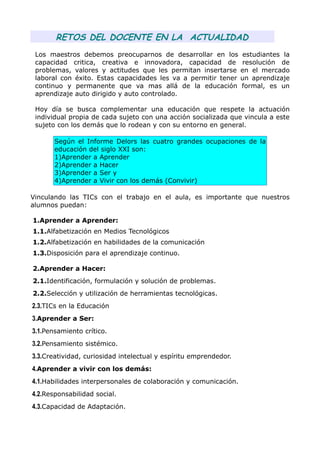 Los maestros deben desarrollar en los estudiantes la capacidad crítica, creativa e innovadora y la resolución de problemas para que puedan insertarse con éxito en el mercado laboral. Además, deben complementar la educación individual con una acción socializada que vincule a los estudiantes con los demás y su entorno. Según el Informe Delors, la educación del siglo XXI debe enfocarse en que los estudiantes aprendan a aprender, a hacer, a ser y a vivir con los demás. Para lograr esto, es importante vincular
