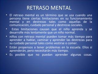 El documento describe el retraso mental, una condición que causa limitaciones en el funcionamiento mental y las habilidades de una persona. Puede ser causado por factores genéticos, problemas durante el embarazo, o traumas después del nacimiento. Existen diferentes grados de retraso mental desde leve a profundo, que afectan el desarrollo del lenguaje, las habilidades sociales y la capacidad de aprendizaje de una persona. El tratamiento incluye terapias como psicopedagogía, fonoaudiología y psicomotricidad.