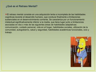 El retraso mental se define por un CI inferior a 70 y limitaciones en habilidades adaptativas. Puede ser leve, moderado, grave o profundo según el rango de CI. Las causas incluyen factores genéticos, perinatales y posnatales. Se caracteriza por limitaciones en comunicación, cuidado personal y habilidades sociales. La educación y terapia buscan maximizar la independencia y autonomía de acuerdo con las capacidades individuales.