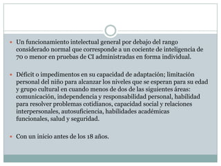El documento describe el retraso mental, definiéndolo como un trastorno del desarrollo caracterizado por un funcionamiento intelectual por debajo de lo normal y déficits en habilidades adaptativas. Explica que puede ser causado por factores genéticos, problemas durante el embarazo o el parto, infecciones, traumas, intoxicaciones y privación ambiental. También describe la clasificación, síntomas, evaluación e intervención temprana para el retraso mental.
