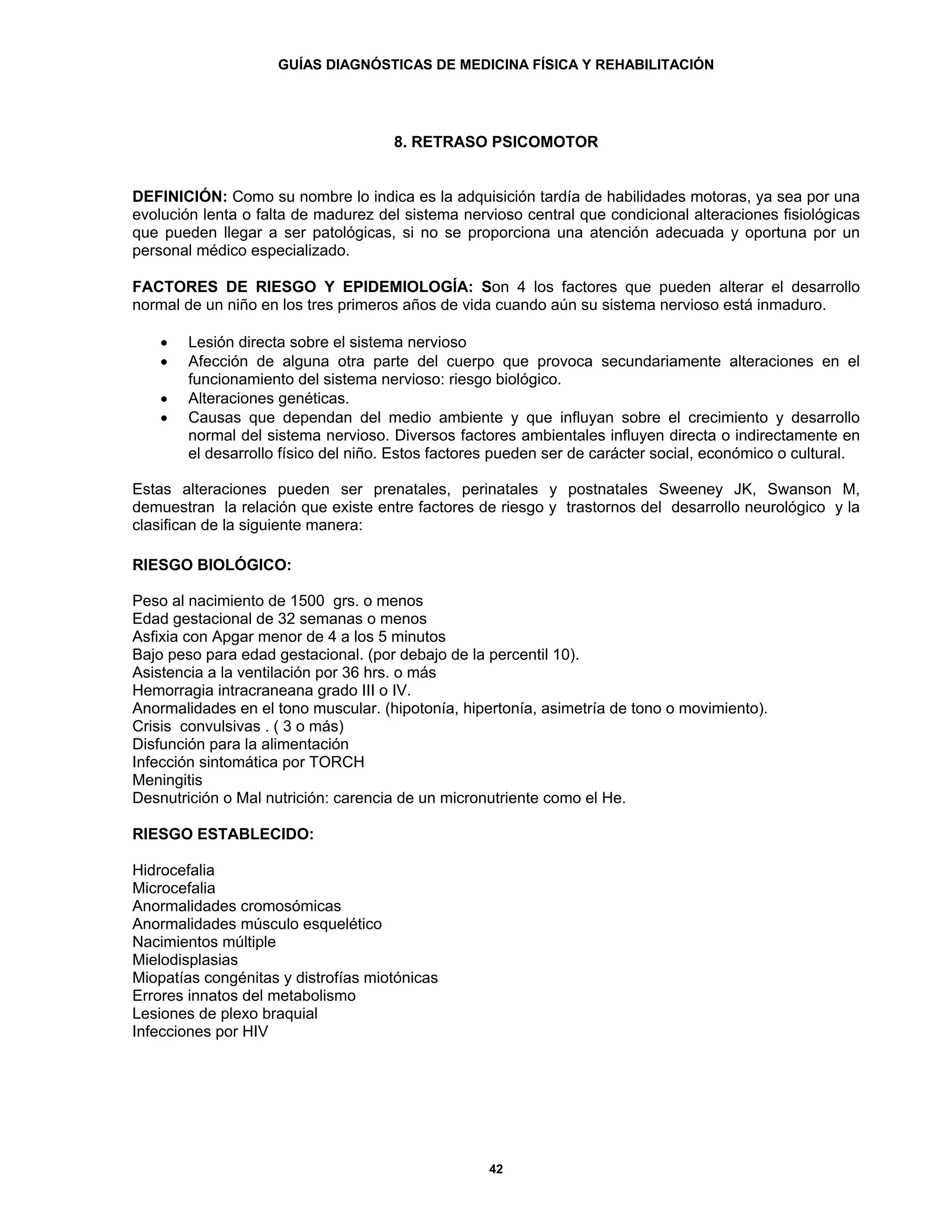 Este documento describe el retraso psicomotor, incluyendo su definición, factores de riesgo, cuadro clínico, criterios diagnósticos y tratamiento. El retraso psicomotor se refiere a la adquisición tardía de habilidades motoras debido a alteraciones en el desarrollo del sistema nervioso central. Los factores de riesgo incluyen lesiones del sistema nervioso, afecciones médicas, alteraciones genéticas y ambientales. El tratamiento involucra programas de estimulación temprana que se enfocan en