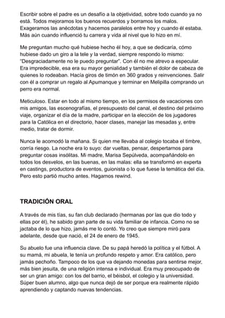 Gonzalo Bertrán fue un pionero y exitoso director de televisión chileno que falleció en 2001 a los 56 años. Creó numerosos programas e hizo transmisiones históricas, combinando contenido popular y cultural. Tuvo un liderazgo y trabajo éticos naturales y formó equipos exitosos. Su hijo Eduardo lo recuerda con cariño como un padre dedicado aunque impredecible que amaba viajar y pasarlo bien con los demás.