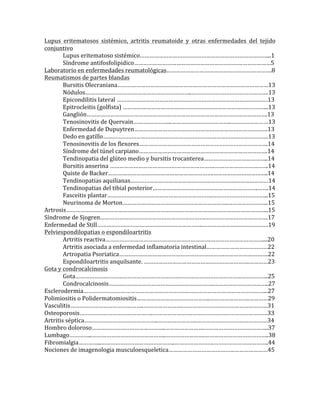 Este documento resume las características clínicas y de laboratorio del lupus eritematoso sistémico (LES), incluyendo sus manifestaciones más frecuentes como artritis, lesiones cutáneas, nefritis y anormalidades hematológicas y serológicas. También describe brevemente otras enfermedades del tejido conjuntivo como el síndrome antifosfolipídico y la artritis reumatoide.