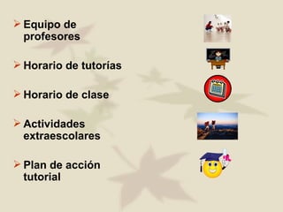 El documento presenta el plan de acción tutorial de un colegio para el curso escolar 07-08. Incluye información sobre el equipo de profesores, el horario de tutorías, las actividades extraescolares, y las acciones a llevar a cabo a lo largo del curso como el seguimiento del alumnado, la coordinación con las familias, la atención a necesidades educativas especiales y la promoción de los alumnos al final del curso.