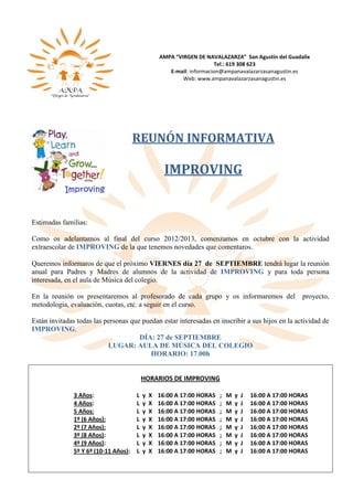 El documento anuncia una reunión informativa el 27 de septiembre para presentar el programa extraescolar IMPROVING del colegio. Se informará sobre el profesorado, la metodología, la evaluación y las cuotas para el curso. También se incluyen los horarios de las clases de IMPROVING para diferentes edades.