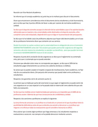 La reunión con la Vicerrectoría Académica discutió el documento presentado por los estudiantes. Coincidieron en varios puntos pero identificaron 3 difíciles de implementar debido a normativas. La baja de aranceles depende del presupuesto. No se han desvinculado profesores adjuntos ni honorarios. Se debe cerrar administrativamente el semestre para inscribir asignaturas pero académicamente se extiende hasta el 21 de octubre. No se contempla anular asignaturas pero sí extender. Se aclararon varios