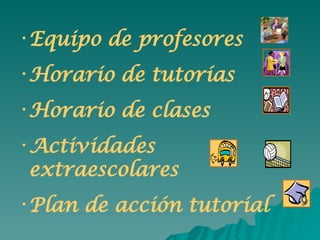 El documento presenta el plan de acción tutorial para el curso escolar 2007-2008 del Colegio Sagrada Familia. Incluye el horario de clases y tutorías, las actividades extraescolares planeadas, y los objetivos y responsabilidades para cada aspecto de la acción tutorial como el conocimiento de los alumnos, su seguimiento, la adecuación de la enseñanza, la coordinación del profesorado, la implicación de las familias y la atención a necesidades educativas especiales.