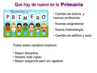 El resumen describe los cambios planeados en la escuela primaria como mayor disciplina, un horario más estricto y mayores expectativas académicas. También señala que habrá nuevos maestros, asignaturas, metodologías de enseñanza y un edificio escolar diferente. Se pide a los padres que participen en actividades escolares y se coordinen con los tutores de sus hijos para apoyar el aprendizaje. Finalmente, se proporciona información sobre la evaluación de los estudiantes, actividades extracurriculares y