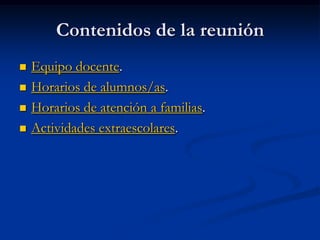El documento presenta la información de una reunión de familias del tercer curso de primaria del colegio C.P Amadeo Tortajada en Mislata. Se detallan los horarios de las asignaturas de los alumnos, los miembros del equipo docente, los horarios de atención a familias de cada asignatura y profesor, y las actividades extraescolares planificadas para el curso como excursiones al Bioparc, Oceanográfico y Jardín Botánico de Valencia.