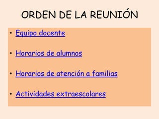 Este documento presenta la información sobre una reunión de padres del 2o curso de primaria. Detalla el equipo docente y sus horarios de atención, el horario de los alumnos, los horarios de atención a familias de los profesores y las actividades extraescolares planificadas.