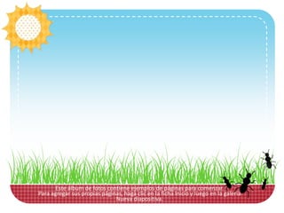 Este documento presenta instrucciones para crear un álbum de fotos familiar utilizando una plantilla de páginas de ejemplo y herramientas para agregar nuevas diapositivas y editar imágenes, como ajustar el contraste, brillo o recortar las fotos.