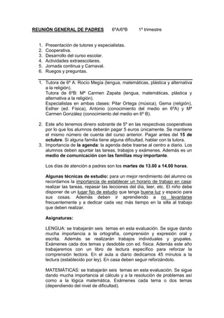 Este documento presenta la reunión de padres del primer trimestre para los cursos 6oA y 6oB. Se introducen los tutores y especialistas, se informa sobre la cooperativa escolar, el desarrollo del curso y las asignaturas. También se detallan las actividades extraescolares previstas como salidas en bicicleta y bolera, así como la excursión de fin de curso a un albergue. Por último, se mencionan el Carnaval y la posible implantación de la jornada continua.