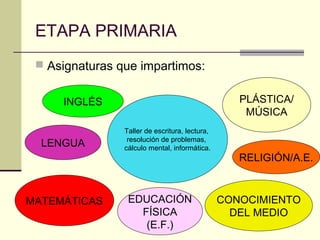 Este documento presenta información sobre el personal docente y las asignaturas de la etapa primaria en un colegio. Detalla los objetivos generales del centro de promover la convivencia, mejorar las habilidades de lectura y escritura, y fomentar el placer por la lectura. También describe las actividades complementarias, normas, material necesario, y el blog del colegio.