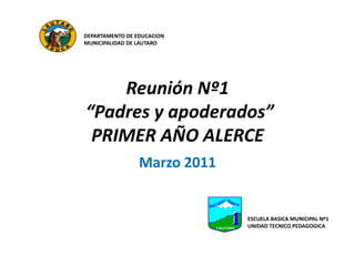 La reunión trata sobre el inicio del año escolar en la Escuela Básica Municipal No1. Se presenta el temario que incluye la bienvenida, educar con valores, el PEI, diagnóstico inicial, calendario escolar y organización de cursos. Se pide a los padres participar activamente para lograr los objetivos educativos y formar estudiantes íntegros. También se entrega información sobre los aprendizajes esperados y sugerencias para apoyar a los niños en casa.