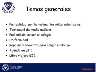 Este documento resume los temas discutidos en una reunión de padres para el curso de Educación Infantil 1. Se abordan cuestiones como la puntualidad, el tentempié, la pediculosis y el uniforme. También se mencionan las terapias de logopedia, los refuerzos educativos, la biblioteca y el blog del colegio. Se explica la metodología de evaluación y aprendizaje, así como las fechas importantes hasta final de curso como excursiones y fiestas. Finalmente, se describen las características