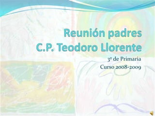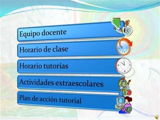 Este documento presenta el horario semanal y los profesores asignados a un curso de 3er grado de primaria. Además, detalla 10 objetivos y las acciones correspondientes para la tutoría de los estudiantes a lo largo del curso escolar 2008-2009.