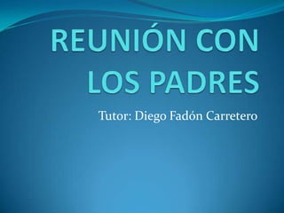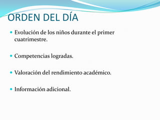 Este documento presenta el orden del día de una reunión de tutores. Incluye una actualización sobre el progreso y logros de los estudiantes durante el primer cuatrimestre, una evaluación de su rendimiento académico mediante una webquest sobre la Navidad, y detalles adicionales sobre el calendario escolar.