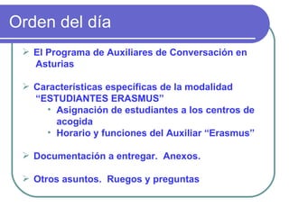 Este documento presenta la reunión informativa para estudiantes Erasmus que serán auxiliares de conversación en Asturias durante el curso 2009-2010. Se explican las características específicas del programa Erasmus, como el apoyo a programas bilingües en centros de la zona central de Asturias y una duración de noviembre a mayo. También se detallan las funciones de los auxiliares, como asistir al profesor pero sin impartir docencia en solitario, y documentación requerida como certificados y un informe final