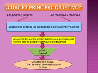 Este documento presenta la información para el curso escolar 2013/2014, incluyendo la tutora Ma del Carmen Sánchez Campaña, el desarrollo de capacidades de los estudiantes a través de la colaboración entre maestros, familias y estudiantes, y las diferentes competencias que los estudiantes deben adquirir como comunicación, matemáticas, conocimiento del mundo físico, habilidades sociales, y más. También describe actividades para practicar estas competencias y las responsabilidades de maestros, familias y estudiantes.