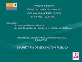 El documento presenta la propuesta de trabajo para la tercera etapa de un proyecto educativo para la detección, prevención y atención de la violencia contra las mujeres en institutos tecnológicos de México. El proyecto busca sensibilizar a la comunidad estudiantil sobre los derechos de la mujer y tipos de violencia a través de materiales didácticos, talleres y visitas a clases. Se detallan las actividades planeadas como la capacitación de profesores, elaboración de manuales y estadísticas para evaluar el progreso