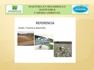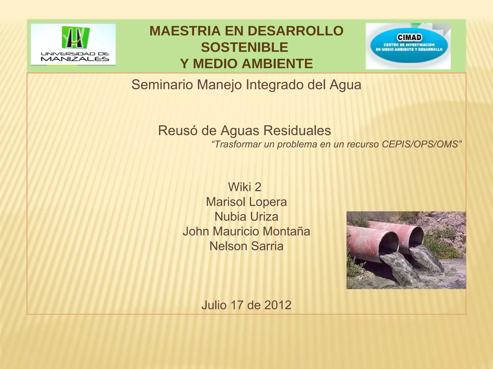 Este documento presenta información sobre el reúso de aguas residuales. Resume los objetivos del seminario, que incluyen realizar una caracterización del reúso considerando factores socioeconómicos, ambientales y legales, así como presentar experiencias internacionales significativas. También describe los tipos de aguas residuales, tratamientos para facilitar el reúso, posibles destinos del agua tratada y algunas experiencias de reúso en países como Israel, México e India.
