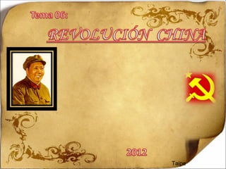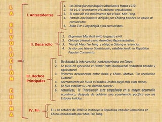 1. La China fue monárquica hasta 1912 cuando se estableció un gobierno republicano liderado por el Kuomintang. 2. El Kuomintang estaba dirigido por Chiang Kai-shek y se opuso al Partido Comunista Chino liderado por Mao Zedong. 3. En 1949, Mao derrotó a Chiang en la guerra civil estableciendo la República Popular China comunista.