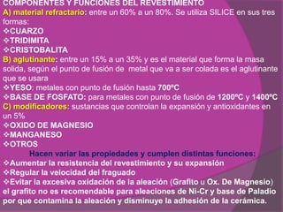 Este documento describe los componentes y propiedades de los revestimientos refractarios utilizados en la fundición de metales. Los revestimientos contienen principalmente material refractario como sílice (60-80%), aglutinantes como yeso o fosfato (15-35%) y modificadores (5%). Los revestimientos yesosos y fosfáticos se usan dependiendo del punto de fusión del metal. Los revestimientos deben ser porosos, resistir altas temperaturas, y expandirse para compensar la contracción del metal durante el enfriamiento.