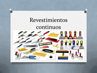 Los revestimientos protegen los cerramientos interiores y exteriores y mejoran su aspecto estético. Los materiales comunes incluyen morteros de cemento, cal y arena que se usan para hacer revocos, enfoscados y monocapas. Los revestimientos interiores incluyen yeso para guarnecidos y enlucidos. Los estucos permiten texturas decorativas mediante capas de mortero coloreado.