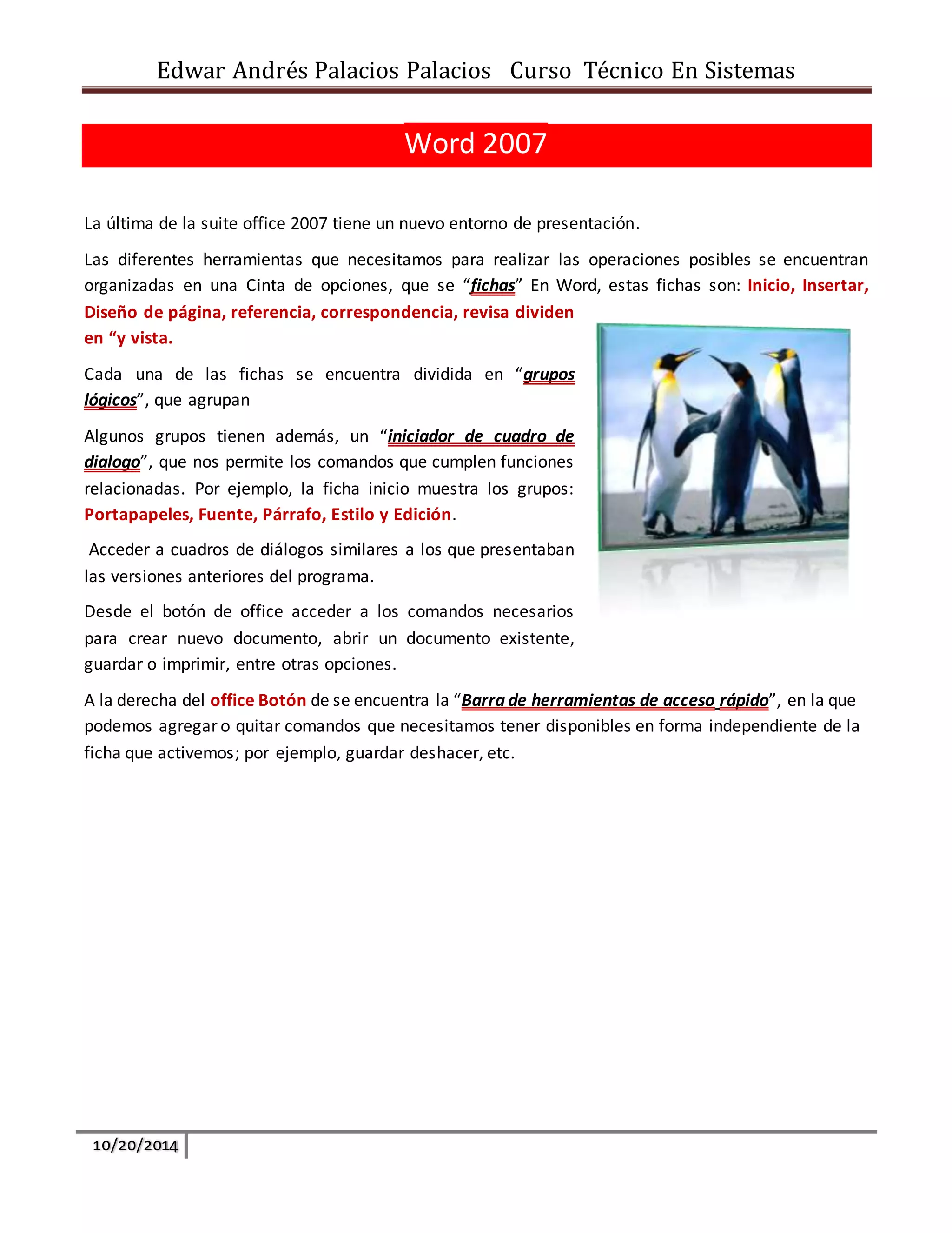 El documento describe las nuevas características de la interfaz de usuario de Microsoft Word 2007, incluyendo una cinta de opciones que organiza las herramientas en fichas como Inicio, Insertar y Diseño de página. Cada ficha contiene grupos lógicos de comandos relacionados y algunos grupos incluyen cuadros de diálogo. El botón de Office permite crear, abrir y guardar documentos, e imprimir. A la derecha hay una barra de herramientas de acceso rápido para agregar comandos comunes como guard