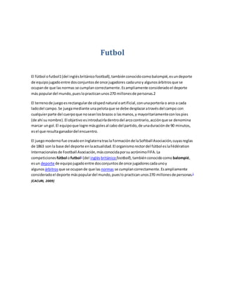 1) El fútbol es un deporte jugado entre dos equipos de 11 jugadores cada uno, cuyo objetivo es anotar goles introduciendo la pelota en la portería contraria.
