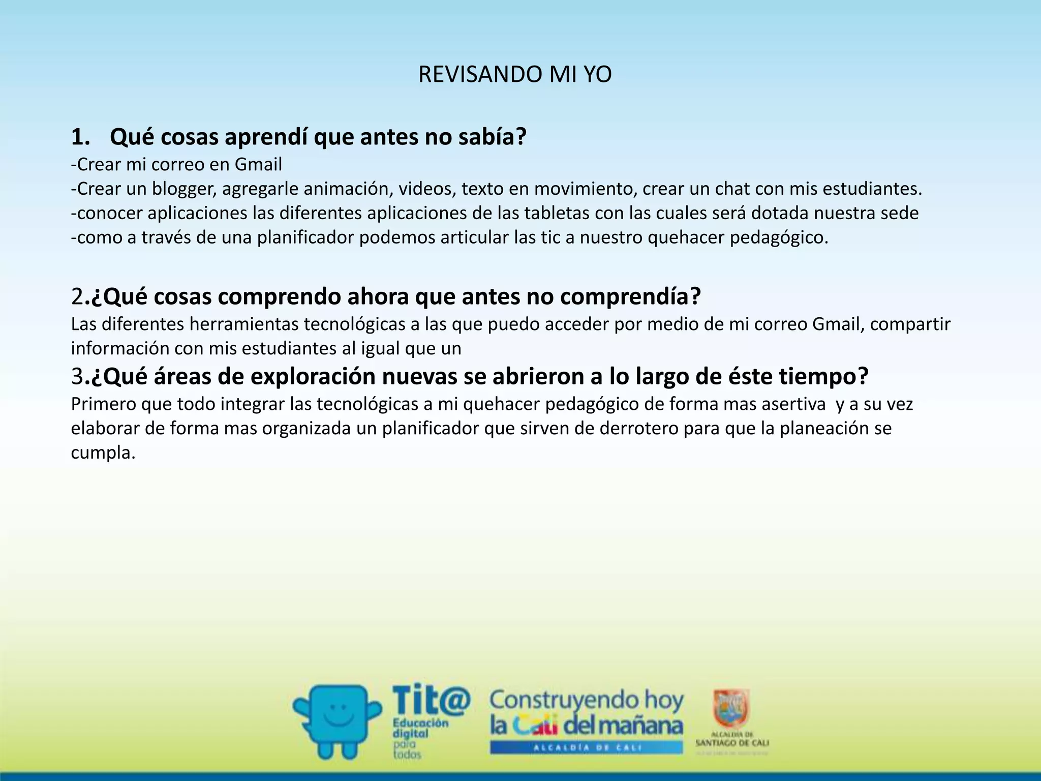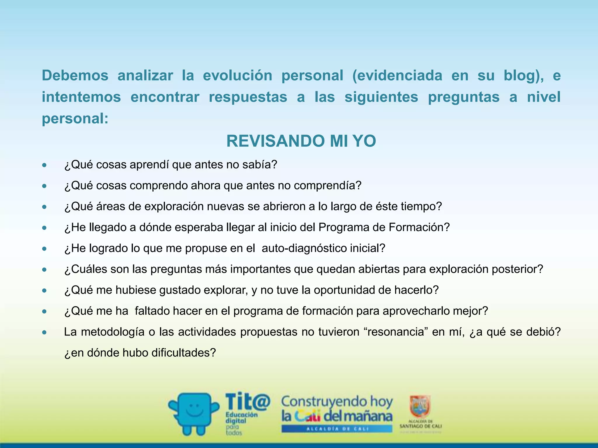 Este documento presenta una serie de preguntas para que una persona revise su desarrollo personal a través de un programa de formación, incluyendo qué cosas aprendió, comprendió, áreas de exploración nuevas, logros respecto a metas iniciales, preguntas abiertas y aspectos que le hubiese gustado explorar más. La persona indica varios aprendizajes técnicos adquiridos y una mejor comprensión de herramientas digitales. Expresa haber alcanzado sus expectativas y metas iniciales a pesar de no haber podido profund