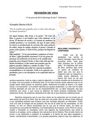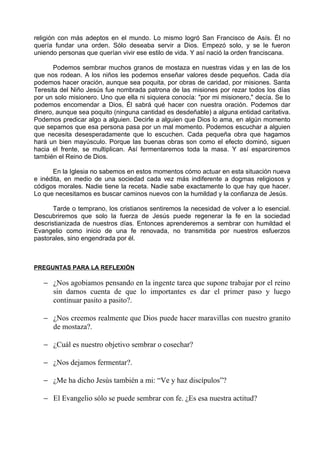 El documento habla sobre la parábola de Jesús del grano de mostaza y la levadura en la masa. Explica que aunque empecemos con algo pequeño, como un grano de mostaza o un poco de levadura, con paciencia y confianza esto puede crecer y extenderse grandemente. Así, incluso las pequeñas acciones de amor que hacemos cada día, como orar o ayudar a otros, pueden producir grandes frutos si lo hacemos con fe en Dios. El documento también reflexiona sobre cómo la iglesia puede sembrar el evangel