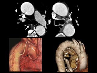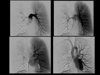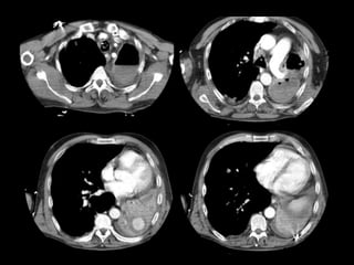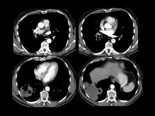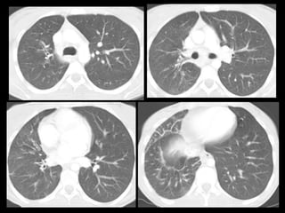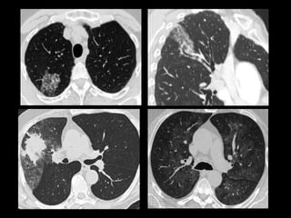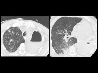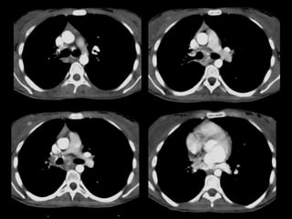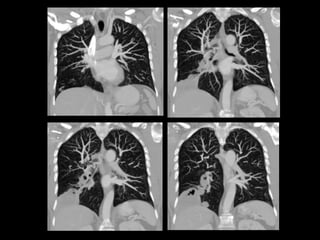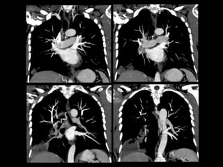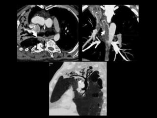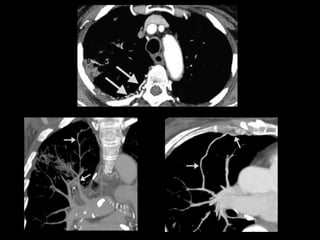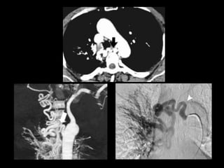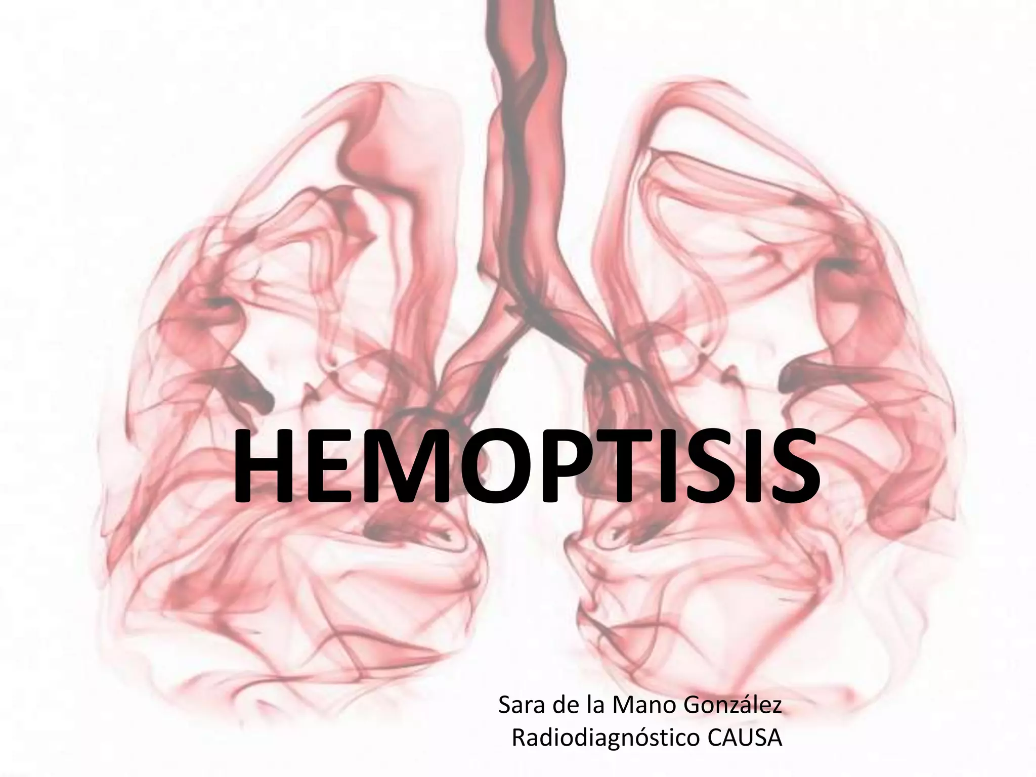 El documento habla sobre la hemoptisis, o sangrado por la boca, y sus causas. Puede deberse a sangrado de pequeños o grandes vasos pulmonares. Entre las causas se incluyen enfermedades infecciosas como la tuberculosis, enfermedades cardiovasculares como aneurismas, neoplasias, y vasculitis. La angioTC es útil para diagnosticar la causa del sangrado y planificar una posible embolización. El resangrado después de la embolización puede deberse a oclusión incompleta de los vasos o apar