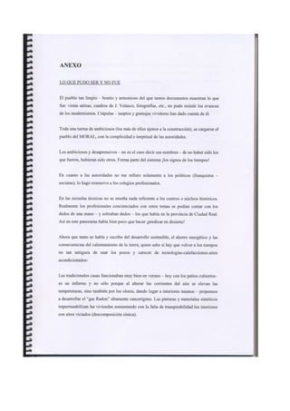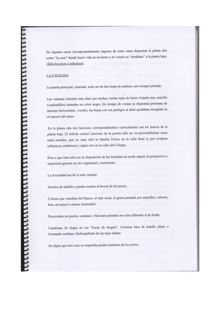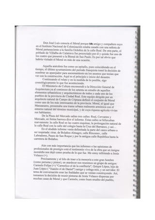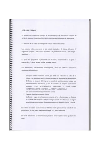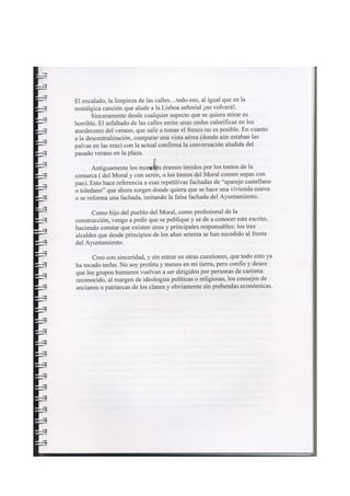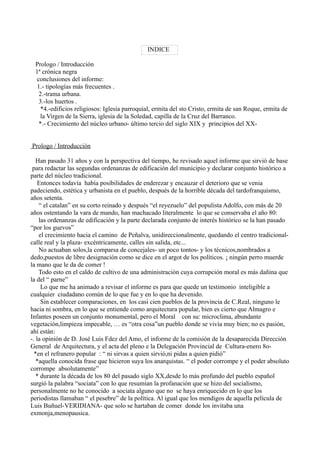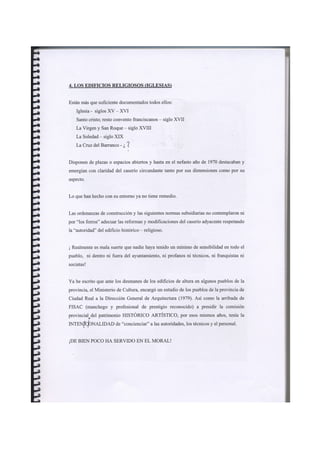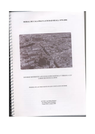 Este documento resume un informe revisado sobre el paisaje urbano y rural de Moral de Calatrava realizado en 1980. Resalta las tipologías arquitectónicas más frecuentes, la trama urbana y los huertos. Describe seis edificios religiosos notables como la iglesia parroquial de San Andrés y varias ermitas. Explica el crecimiento del núcleo urbano en los siglos XIX y XX y critica el deterioro posterior de la planificación y el patrimonio histórico a pesar