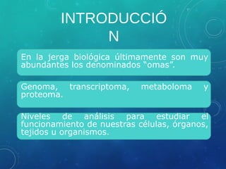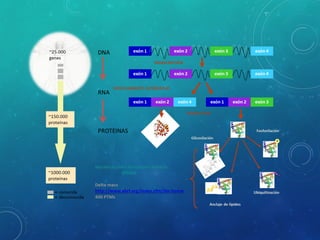 El documento describe el proyecto del proteoma humano. Explica que las proteínas son las verdaderas expresiones funcionales del genoma y que el número de proteínas en humanos es mayor que el número de genes. También resume la historia de la genética y la genómica y define el proteoma como el conjunto completo de proteínas expresadas por una célula.