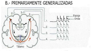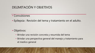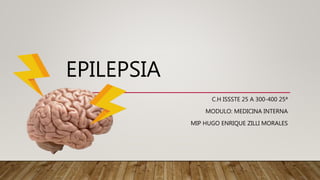 La epilepsia es una enfermedad neurológica crónica caracterizada por crisis convulsivas recurrentes. Se diagnostica clínicamente mediante la descripción de las crisis y pruebas como el EEG y la RM cerebral. El tratamiento consiste principalmente en medicamentos antiepilépticos como lamotrigina o valproato de magnesio en monoterapia para controlar las crisis y prevenir recurrencias, buscando el menor efecto secundario posible.