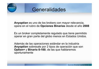 Anyoption es un broker de opciones binarias regulado que ha estado operando desde 2008. Ofrece cinco tipos de operaciones a través de una plataforma accesible desde cualquier dispositivo. La plataforma proporciona capacitación y una cuenta demo para que los clientes aprendan. Anyoption está regulado por la CySEC de Chipre y ofrece depósitos y retiros en varias monedas.