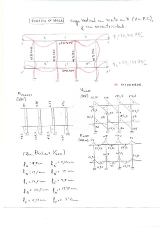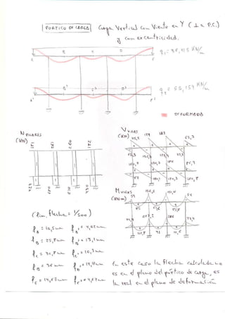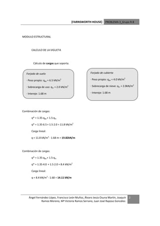 Este documento presenta cálculos estructurales para la casa Farnsworth. Se calculan las cargas que soportan las viguetas y el pórtico, y se dimensionan los perfiles necesarios. Se simplifica el modelo del pórtico a una viga continua de 3 vanos y dos vuelos. Los perfiles requeridos son IPE 500 para la vigueta sanitaria, IPE 450 para la vigueta de cubierta, y UPN 350 y 300 para los forjados del pórtico.