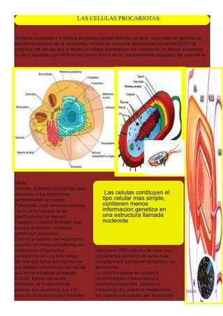 Las células procariotas son las células más simples que carecen de un núcleo definido y su material genético se encuentra disperso en el citoplasma en una estructura llamada nucleoide. Son unicelulares y se cree que todos los organismos actuales derivan de una forma procariota original. Se reproducen de forma asexual por bipartición o pueden intercambiar material genético a través de la conjugación, transducción o transformación.