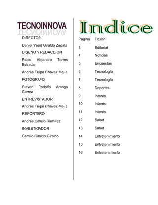 El documento resume varias noticias y actividades del colegio como encuestas sobre materias y profesores preferidos, una jornada deportiva, nuevos proyectos de sensibilización y diversidad. También incluye una entrevista a una profesora, información sobre deportes, tecnología, salud y entretenimiento.