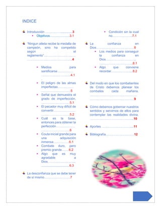 El documento es una guía espiritual orientada a alcanzar la perfección cristiana a través de la auto-reflexión, la renuncia al pecado y el uso de medios adecuados para la santificación. Se enfatiza la importancia de la humildad, la confianza en Dios y la lucha diaria contra las malas inclinaciones para lograr una verdadera vida espiritual. Además, el texto desafía al lector a examinar sus acciones y a comprometerse con una vida más alineada a los principios cristianos para combatir las tentaciones del alma.