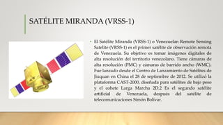 Venezuela cuenta con varios satélites y empresas de telecomunicaciones. Los satélites incluyen el Satélite Miranda (VRSS-1) para observación remota, el Satélite VENESAT-1 (Simón Bolívar) para telecomunicaciones, y el reciente Satélite VRSS2 (Antonio José de Sucre). Las principales empresas son CANTV para telefonía fija y móvil, Digitel y Movistar para telefonía móvil, e Inter y otras para cable e internet.