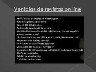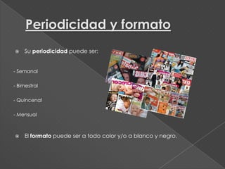 El documento describe los diferentes tipos de revistas, incluyendo su periodicidad (semanal, bimestral, quincenal, mensual), formato (a color y/o blanco y negro), temática (infantiles, femeninas, masculinas, interés general, agro, ecología, espectáculos, deportivas, análisis político y economía, decoración, cocina), y calidad de impresión. También discute factores como segmentación de audiencia, diseño flexible, permanencia, precio, y plazos de cierre y publicación.