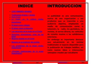 Este documento resume las costumbres y tradiciones de la cultura árabe, incluyendo la vestimenta tradicional, saludos, etiqueta al comer, la boda árabe, la mujer en la cultura musulmana, el Islam como religión y civilización, y los derechos de la mujer en el Corán. Explica las diferencias entre la cultura árabe y occidental y proporciona información sobre varios aspectos de la cultura árabe.