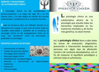 La psicología clínica estudia los trastornos mentales y la salud mental. Evalúa, diagnostica y trata personas con problemas de salud mental o conducta desadaptativa con el objetivo de restaurar el equilibrio psicológico. La psicología clínica se ha estudiado y perfeccionado a lo largo del siglo XX y se aplica en áreas como la terapia familiar e infantil, la neuropsicología y la atención de trastornos específicos.