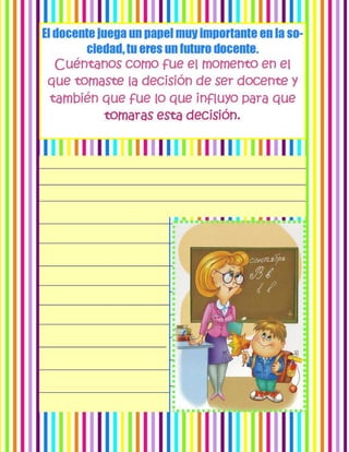Los estudiantes del primer semestre de la Licenciatura en Educación Preescolar realizaron relatos autobiográficos sobre sus vidas y las razones por las cuales decidieron convertirse en docentes. El documento también discute la implementación de las tecnologías de la información y la comunicación en la licenciatura, así como desafíos como la falta de apoyo y la discriminación en la profesión docente.