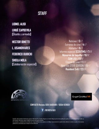 El documento presenta un número de la revista 16:9, destacando entrevistas con Sam Liu, director de animación de Warner, y Steve Gordon, junto con adelantos de estrenos cinematográficos como 'Open Windows' y 'Resident Evil'. También se incluye un informe especial sobre el proceso de scouting para locaciones en producciones cinematográficas. Además, se mencionan cifras de taquilla y se detallan diversos estrenos de películas en cines.